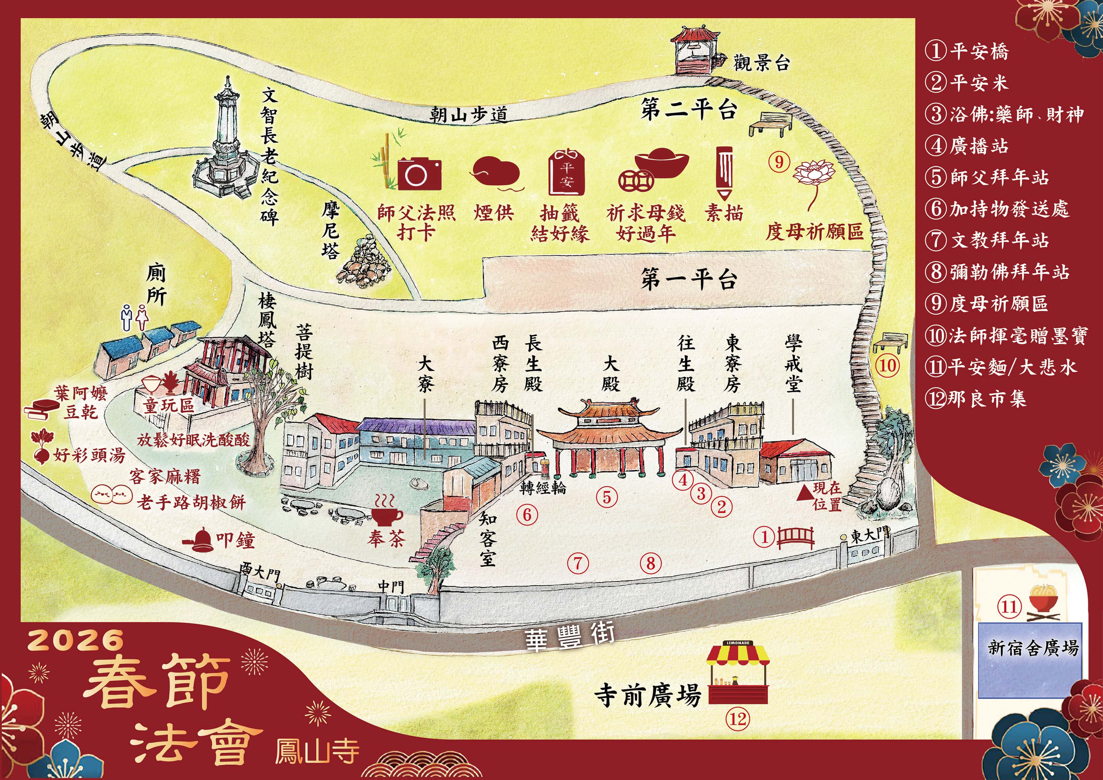 感恩師長慈悲,創辦朝禮法會,也感恩福智僧團法師,年年帶領陪伴著我們度過美好的盛會。2026 年朝禮法會為方便各地同修參加,在四個場地舉辦。其中新竹鳳山寺是在 2/18(初二)、2/19(初三),不須事先報名;雲林福智教育園區是在 2/20(初四) ,須在研討班事先報名;高雄鳳山商工在 2/21(初五),須在研討班事先報名;苗栗月稱光明寺在 2/21(初五)、2/22(初六) 舉行,亦須事先報名。